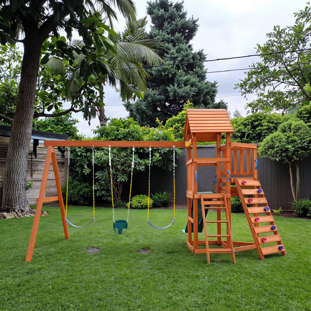 This swing set is perfect for any backyard, offering children the opportunity to develop their motor skills, engage in imaginative play, and enjoy the outdoors in a safe, secure environment. The wooden frame ensures durability, while the weather-resistant materials promise long-lasting enjoyment. Ideal for families looking to enhance their backyard with a versatile, fun, and engaging playset.