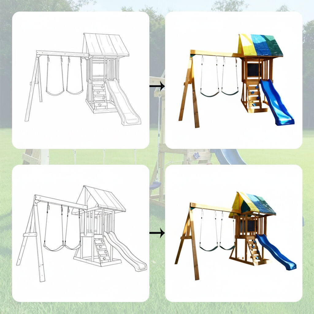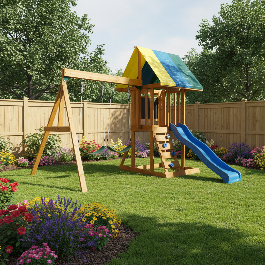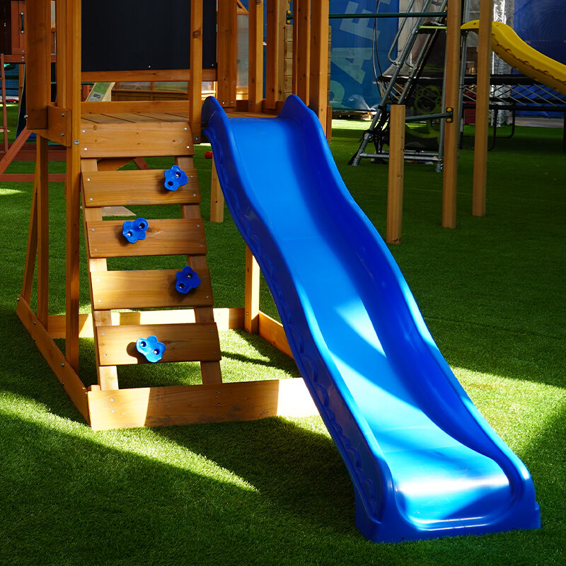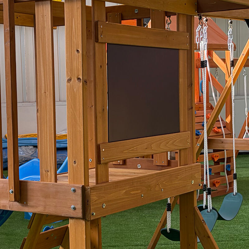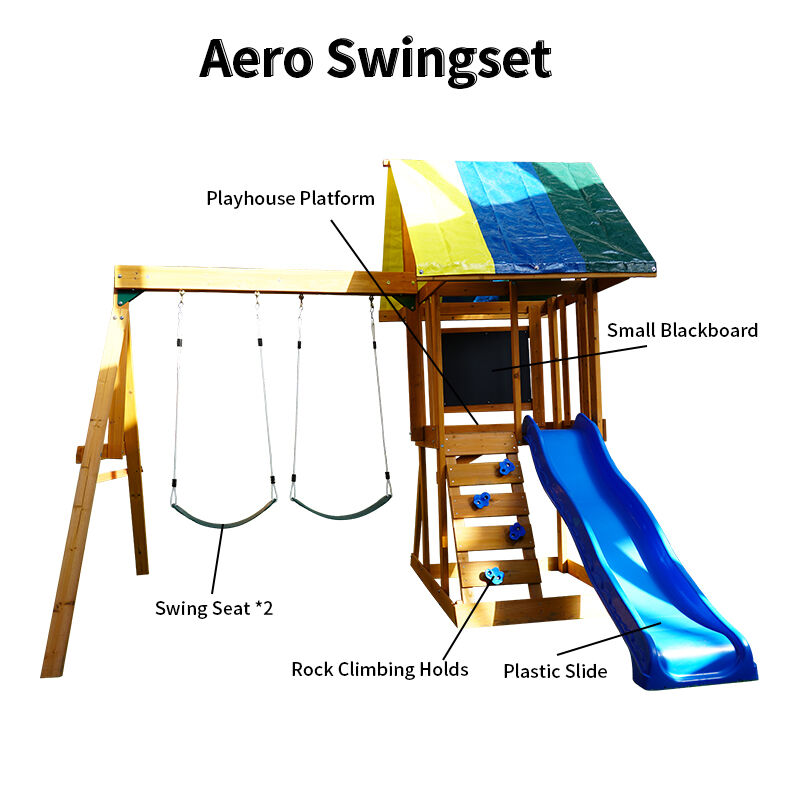 De Aero Schommel is een hoogwaardig buitenspeeltoestel voor kinderen, vervaardigd uit duurzaam Chinees sparrenhout. Het beschikt over dubbele riemschommels, een levendige blauwe golvende glijbaan, een klimladder met grepen en een verhoogd torenplatform met een kleurrijk stoffen afdak en krijtbordwand. Stevig en weerbestendig, ideaal voor avonturen in de achtertuin en stimuleert actief spelen en fantasie.