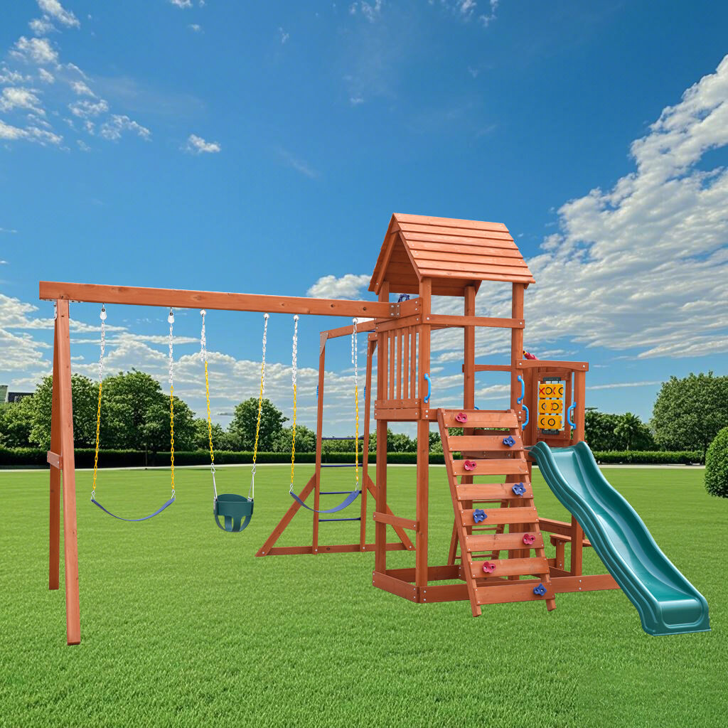 Houten Speeltoestel – Deze buitenspeelconstructie is ontworpen voor actief en fantasierijk spelen, en beschikt over twee verhoogde platforms met een houten dak voor schaduw en duurzaamheid. Het bevat een houten ladder en een klimwand voor veilige toegang, samen met drie schommels voor gezamenlijk spelen. Kinderen kunnen genieten van het interactieve boter-kaas-en-eieren spel, klimmen over de stevige apenkooi en afglijden op de gladde kunststof glijbaan. Gemaakt van sterk hout, is dit toestel ideaal voor gebruik in de achtertuin en bevordert fysieke activiteit, coördinatie en sociale interactie.