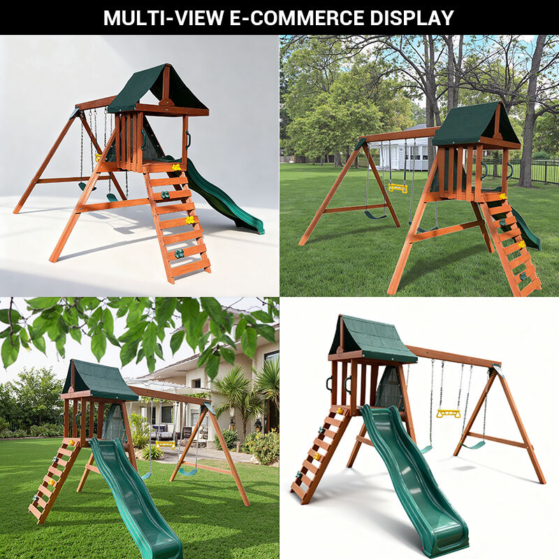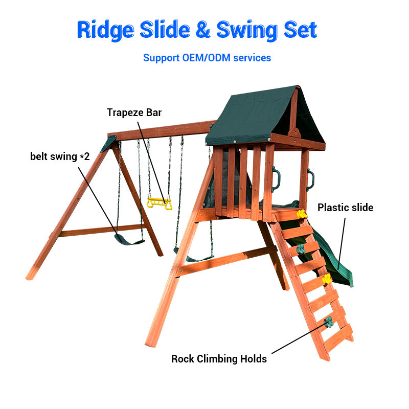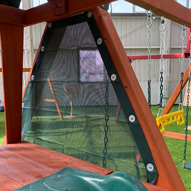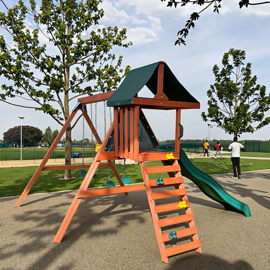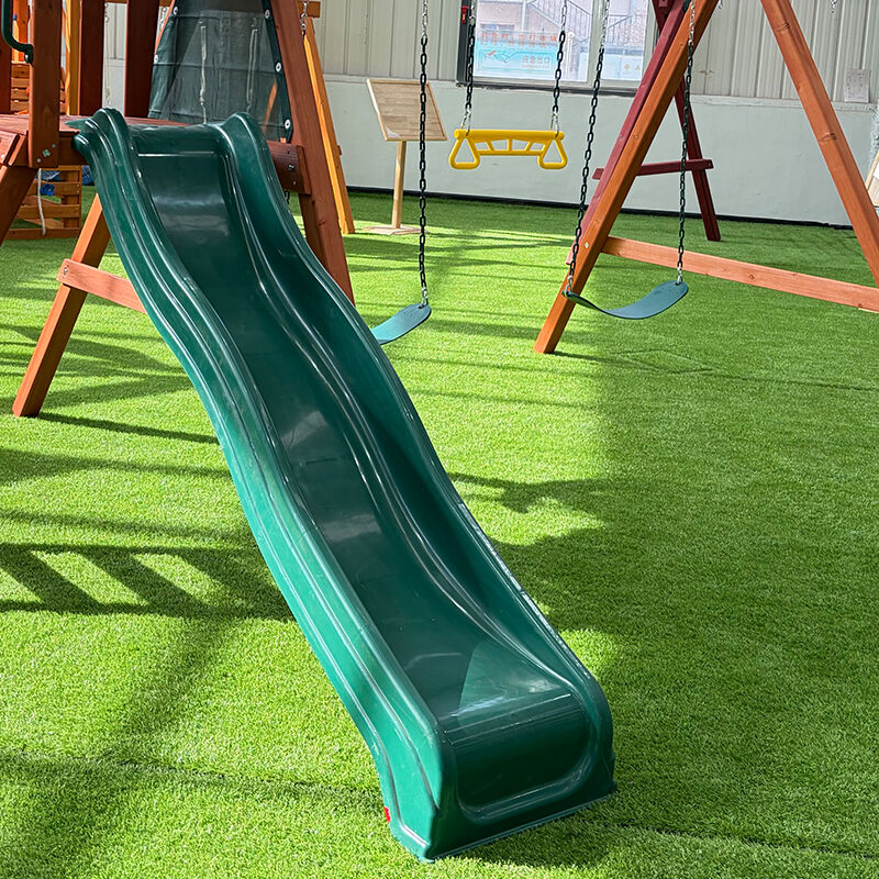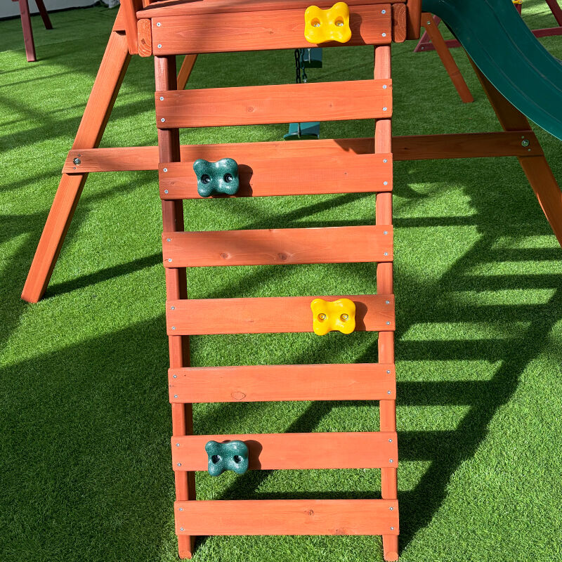Deze houten speeltoestel is vervaardigd uit hoogwaardig Chinese sparrenhout, wat zorgt voor duurzaamheid en natuurlijke weerstand tegen verrotting. Het heeft een kleine toren met een groen canvas dak, een klimmuur met rotsachtige treden, een golfdvormige groene glijbaan, twee schommelzitjes en een trapeze-stang. Perfect voor buitenspeelplezier, stimuleert de verbeelding en lichamelijke activiteit bij kinderen. Veilige ontwerp dat mooi opgaat in elke achtertuin.