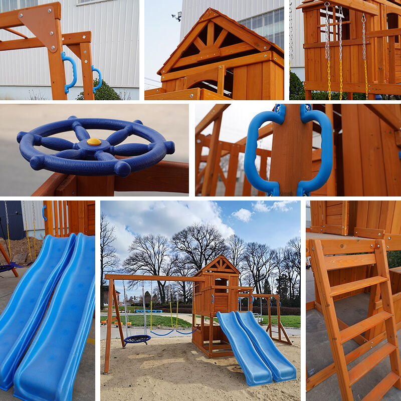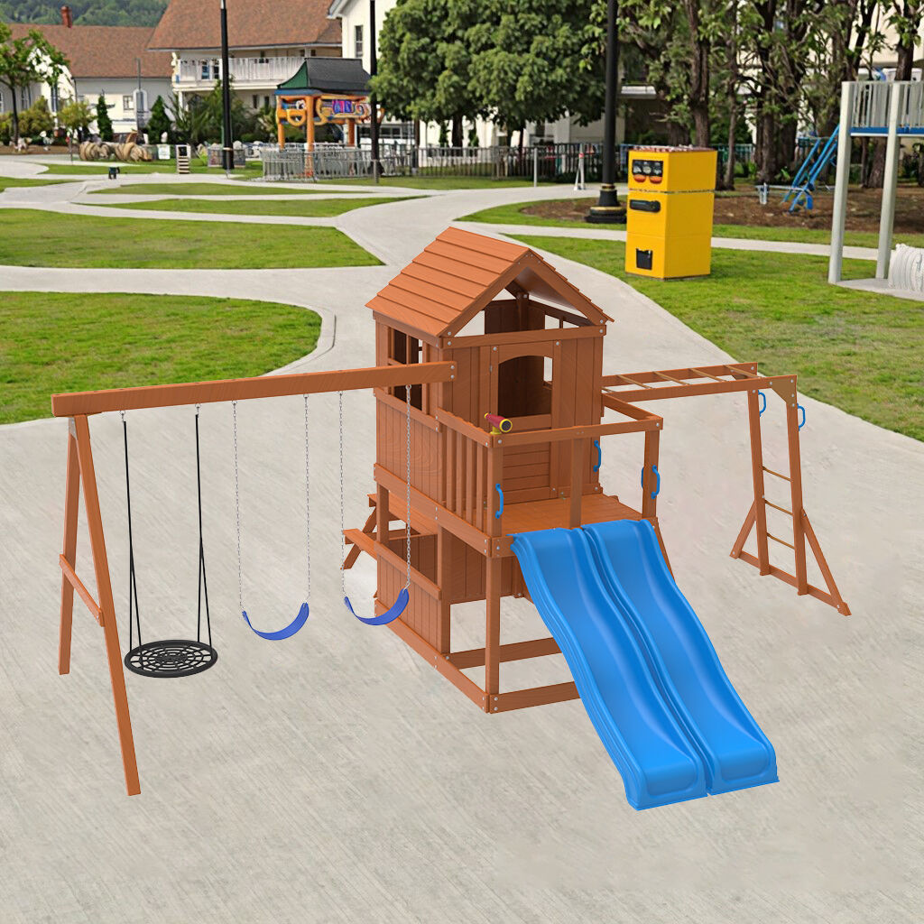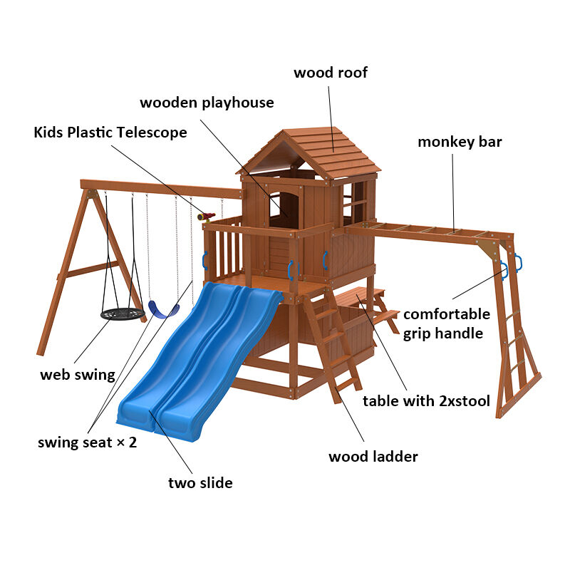 De Skyloft Houten Speeltoestel is het ultieme achtertuinavontuur voor kinderen! Vervaardigd van hoogwaardig Chinees sparrenhout met slijtvaste metalen en kunststof onderdelen voor een lange levensduur. Hoogtepunt: Twee blauwe glijbanen voor spannende races naast elkaar, waarbij het plezier verdubbelt! Inclusief een houten speelhuis, drie schommels (waaronder een nettoetschommel), een houten ladder, een picknicktafel met 2 krukjes en een apenkooi om de verbeelding te prikkelen en coördinatie te ontwikkelen. Het perfecte buitenspeeltoestel voor eindeloze uren vol vreugdevol spelen!