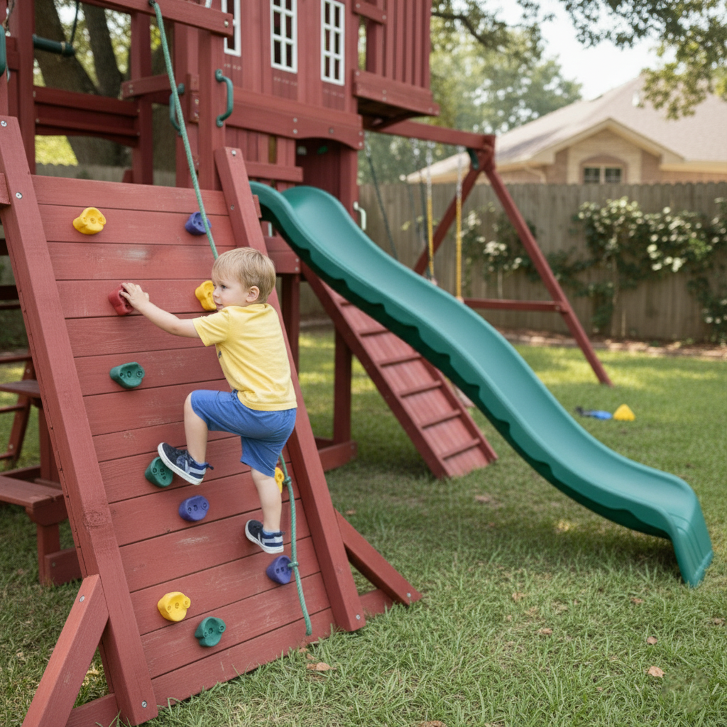 This wooden outdoor playset is designed to bring creative, active fun to any backyard, featuring a multi-level playhouse, durable swings, a smooth slide, and a sturdy climbing wall. Built with high-quality materials for long-lasting outdoor use, it provides children with a safe and imaginative play environment.